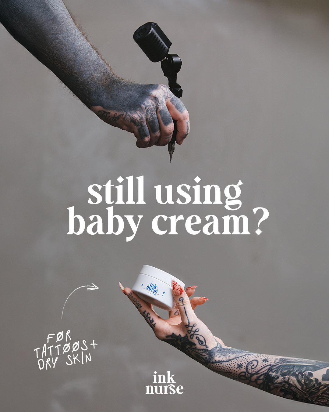 For tattoo aftercare, apply a thin layer of Ink Nurse to clean, dry skin 2–3 times daily during the healing process. Start using it after your initial film wrap is removed—usually within 24 hours—and continue until the tattoo is fully healed. Ink Nurse is specifically formulated to soothe irritation, reduce redness and itch, and promote fast, clean healing without clogging pores. Its natural, non-greasy blend supports the skin barrier and helps preserve your tattoo’s vibrancy from day one.